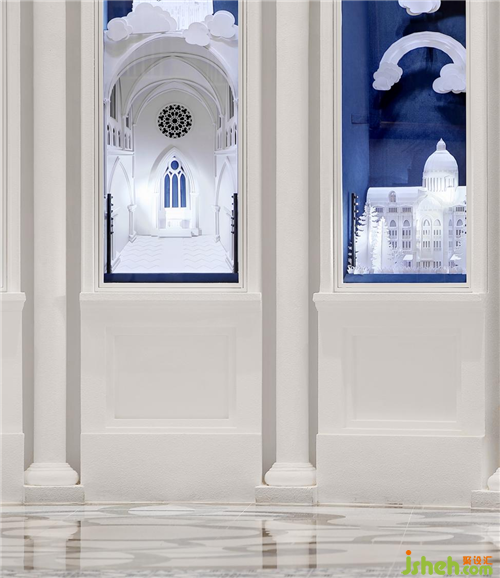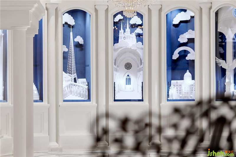 所有的櫥窗,則是以紙藝的形式重現(xiàn)了很多個(gè)法國的經(jīng)典建筑場景,也就是以紙的軟性和空間的剛性形成對比,同時(shí)微縮的場景空間,為各類寶石提供有趣味性的展示背景。