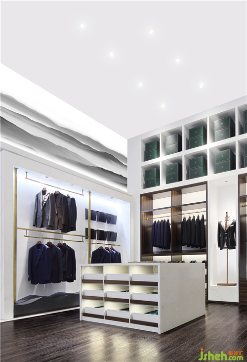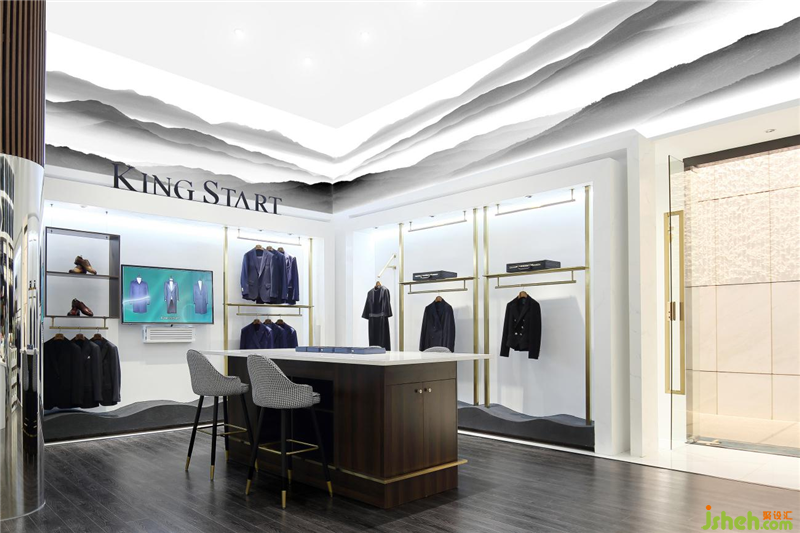 KING SATART高級(jí)成衣定制店,是我們所接觸的他們的第二個(gè)項(xiàng)目,位于河西金奧費(fèi)爾蒙酒店一層,因?yàn)橐恍┈F(xiàn)場(chǎng)條件的限制,這個(gè)項(xiàng)目是對(duì)原有空間的一個(gè)改造?,F(xiàn)場(chǎng)層高4.6米,在不做頂部區(qū)域改動(dòng),并無(wú)法利用挑空做功能使用的情況下,南京店鋪裝修設(shè)計(jì)我們引用“忽聞海上有仙山,山在虛無(wú)縹渺間”的概念,把上部空間做成了發(fā)光的遠(yuǎn)山的形式,而空間的下部區(qū)域,以人的尺度最大滿(mǎn)足展示及儲(chǔ)藏需求。