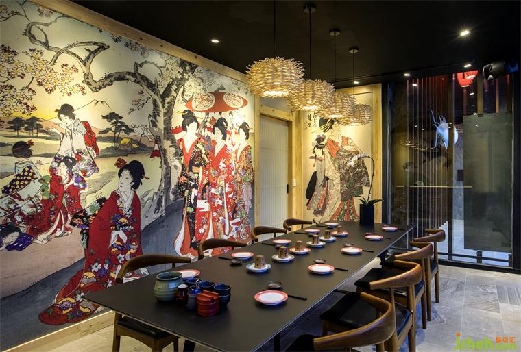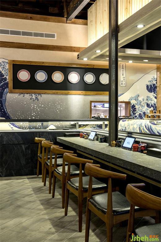 餐廳設(shè)計為強(qiáng)調(diào)『侍悟丸回轉(zhuǎn)壽司』日式料理的文化背景及食材的鮮美。整體空間以入日本最具代表性的浮世繪貫穿全場,重現(xiàn)出江戶時代的繁華,大器又華麗,更讓人猶如置身大海中享用最鮮甜的食材。