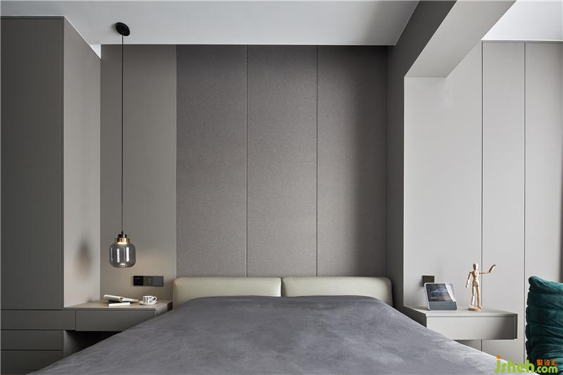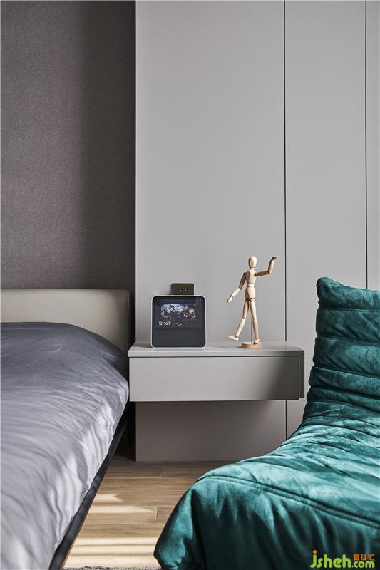 冷色調(diào)的床鋪和背景墻色彩相得益彰
