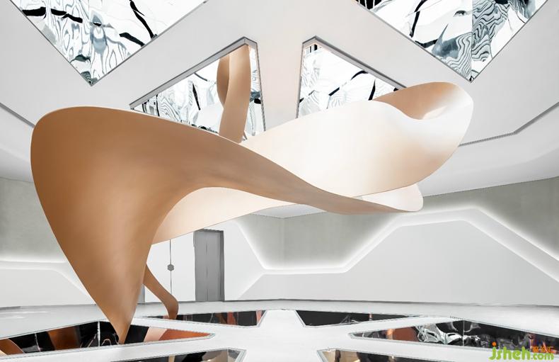每個(gè)三角形的中空結(jié)構(gòu)的內(nèi)壁都是鏡面不銹鋼,形成一個(gè)空間萬花筒,通過光影的折射,畫卷、天空、室內(nèi)環(huán)境,共同形成了一個(gè)變化豐富的視覺亮點(diǎn)。