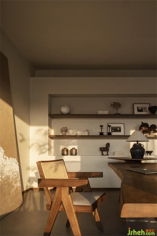 歷史留下沉積,陽光永恒不變。得益于光影的配合,風景也跟隨人的腳步向室內(nèi)延展,生發(fā)令人心生向往的松弛感。一張隨性的長桌茶臺、具有生活包漿感的老木件、落地斜倚的大畫,是空間慵懶的自語。民宿設(shè)計師特意在一層主樓建筑上方增加了長長的格柵屋檐,一直貫通到餐廳連廊,既可遮風擋雨,又能徜徉在自然的風中。拿個蒲團落坐于此,發(fā)呆,看書,聊天,坐看光影在墻面、地上攀爬嬉戲,山里的風吹過門廊,格外輕松。