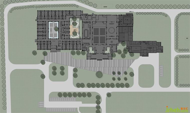 除內(nèi)部空間,3號樓外側(cè)的廣場也是對構(gòu)建布局、整合功能的重要一筆。非對稱式的斜切廣場造型更具現(xiàn)代化,規(guī)避了園區(qū)南北道路對3號樓建筑的沖擊,同時也是對其外圍零散地塊進行有序整合,將東側(cè)2號樓有機納入3號樓的整體布局中,形成附屬功能餐廳,使得3號樓空間功能更加完善。放眼未來,3號樓門前的巨型廣場將兼具政務(wù)和商業(yè)等活動,從而提升整個迎賓館的接待能力。