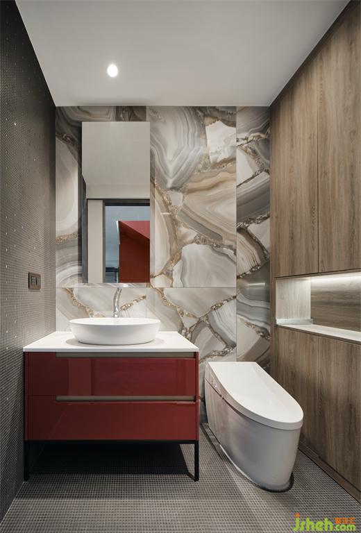 與紅色旋梯遙相呼應(yīng),是客衛(wèi)臺(tái)盆柜那一抹紅。