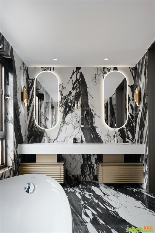 墻地面通鋪的嵌金馬賽克磚與鑲金瑪瑙玉磚的組合,家裝設(shè)計(jì)將奢華質(zhì)感與浪漫氛圍演繹到極致。
