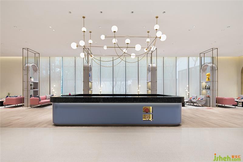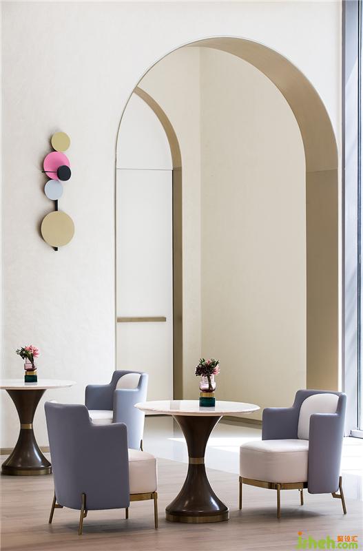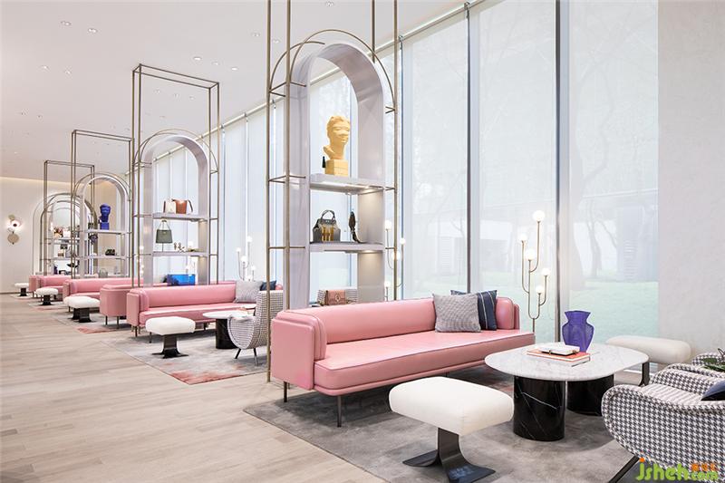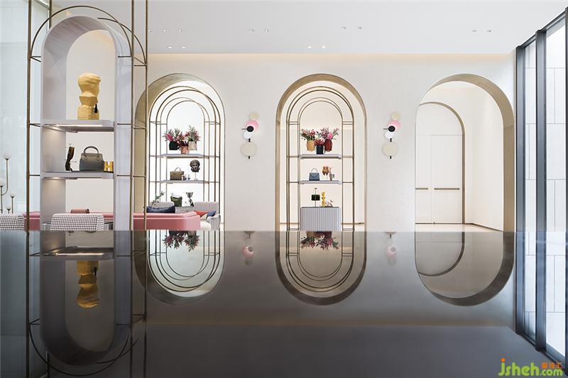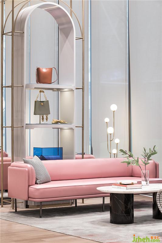 移步深度洽談區(qū),這種購物導向的參與感取代傳統(tǒng)的“單向傳播”,了解消費者的內(nèi)心與感受,進行了一場深入內(nèi)心的對話。取自于甪直地源文化中的暖白成為空間主調,在此基礎上糅和臟粉、金色和青灰色,更具有靚麗女性色彩的空間性格一覽無余。