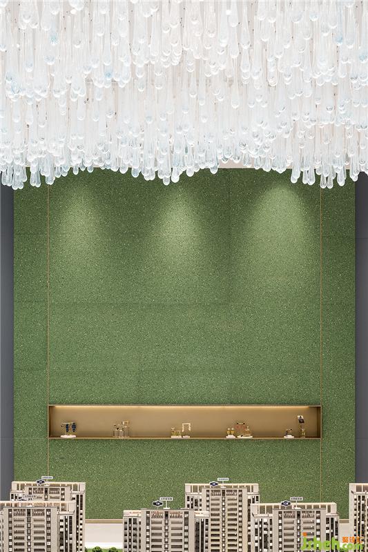 沙盤區(qū)的背景墻選用匠心工藝的綠色預制水磨石,嵌入式黃銅展架里陳列著珠寶,取代了以往的傳統(tǒng)軟裝擺件,迎合女性消費導向。