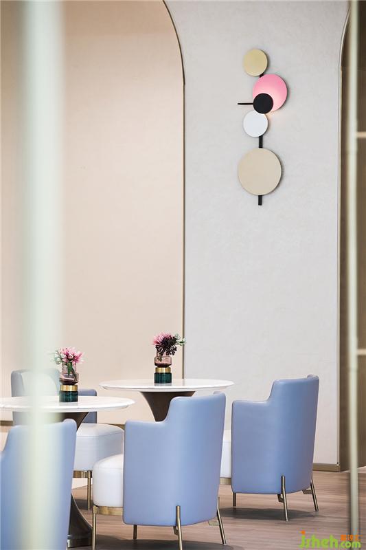 進入洽談區(qū),就仿佛墜入了無邊奇幻的冰雪世界,水藍色基調為整個場域撐起靜謐而平和的不俗氣質。而細節(jié)處淺粉和鵝黃點綴的裝飾,使談話被溫馨輕柔的氛圍包裹。