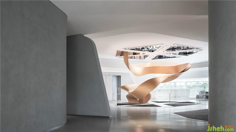 空間采用全透明玻璃,在中間高的主梁側(cè)面全部運用鏡面,在通高視線的同時,形成三邊形空間萬花筒效果。視覺的感知是空間體驗的基礎(chǔ),以純粹的手法,將藝術(shù)、現(xiàn)代、科技、未來、東方、山水人文等元素的融合,形成具有‘當代藝術(shù)館’體驗的展示中心,這也是設(shè)計師孫洪濤的初心所在。