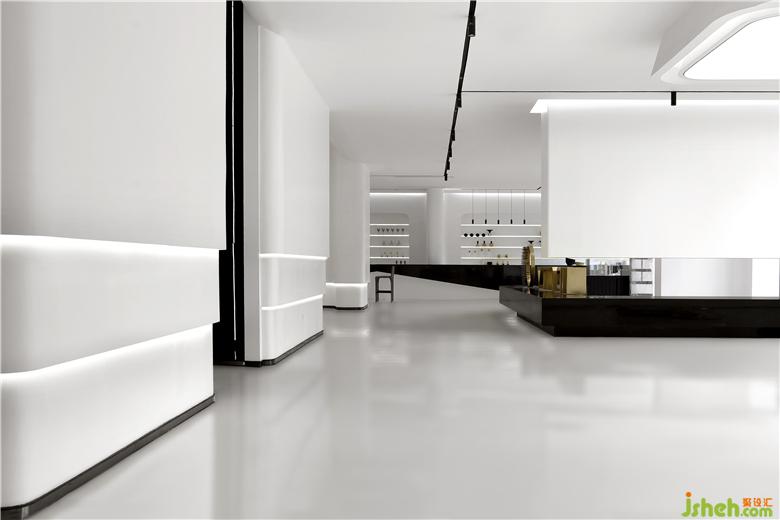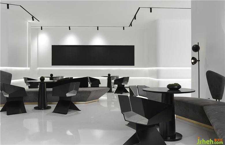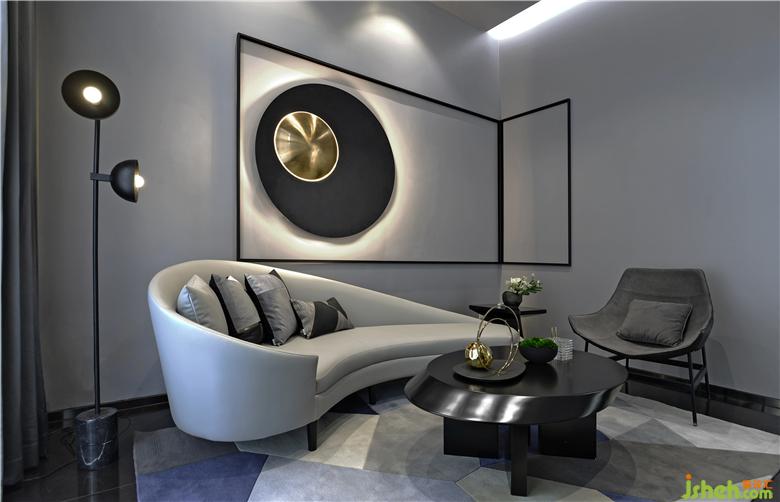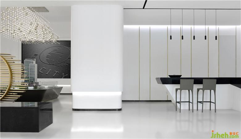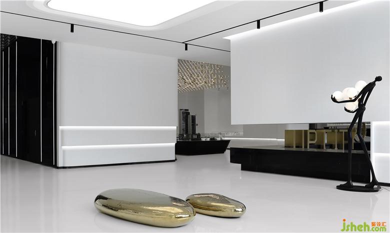 留白,源自于中國(guó)傳統(tǒng)繪畫的構(gòu)圖技巧,以無(wú)形繪有形。在黑與白之間,描刻出形與神的深邃意境,留予人無(wú)限的想象。被這一處白吸了眼,幾縷似水般的光帶,在空間中自由地游走,身影徘徊于明亮與陰影之中,不自覺(jué)的被頂面一道道搖曳的光所吸引著,引導(dǎo)訪客其中漫游,思考,流連。設(shè)計(jì)師拿捏著空間的尺度,通過(guò)對(duì)形體、色彩、質(zhì)感、軟裝來(lái)營(yíng)造一個(gè)頗具性格的藝術(shù)之域,用造型的變化替代多材料的裝飾手法。折線射燈與立面造型相結(jié)合,相應(yīng)可產(chǎn)生深淺變化,形成層次。作品在環(huán)境風(fēng)格上還是取用黑與白之間的對(duì)比,金色為點(diǎn)綴,克制與取舍往往才是走向無(wú)限的通幽之徑。售樓處設(shè)計(jì)