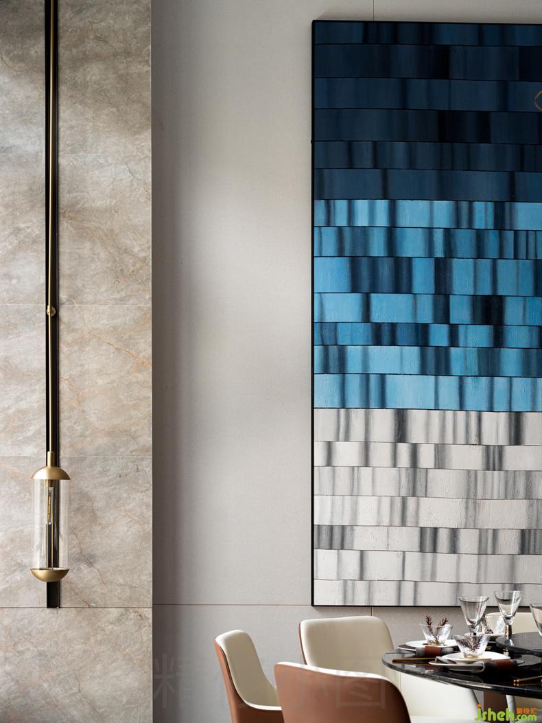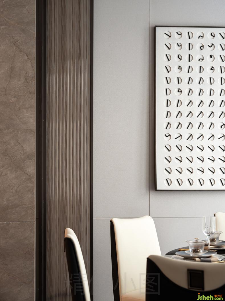 開放式的布局打破空間的界限,點(diǎn)、線、面穿插運(yùn)用于整個(gè)空間,并拌有中式的對稱美學(xué),增添空間的秩序與動(dòng)感。引入空間自然光和空間大面積的落地玻璃加以修飾,延伸出不同的水影之形,水鏡之形,讓具象空間演變?yōu)槌橄罂臻g,醞釀出一首極具寫意韻味的抒情詩。
