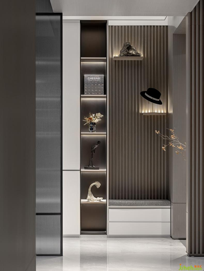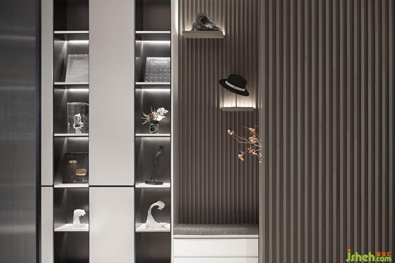 玄關(guān)作為一個(gè)家的序章,承載著傳遞初始印象的關(guān)鍵。這里大量運(yùn)用深色天然木紋飾面,木材的溫潤結(jié)合冷峻的灰色大理石,既凜冽,更溫柔。采用半隔斷的方式達(dá)成過渡性質(zhì),以石材的延續(xù)形成與內(nèi)部空間的溝通,自然引入
