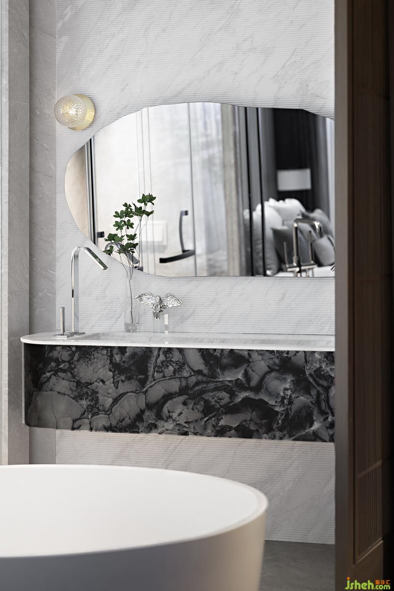 柔和的曲線轉(zhuǎn)合與石材紋理、銀色金屬等材質(zhì)互相呼應(yīng),渲染自由之感,讓情緒輕盈流淌,解放倦意飽和。
