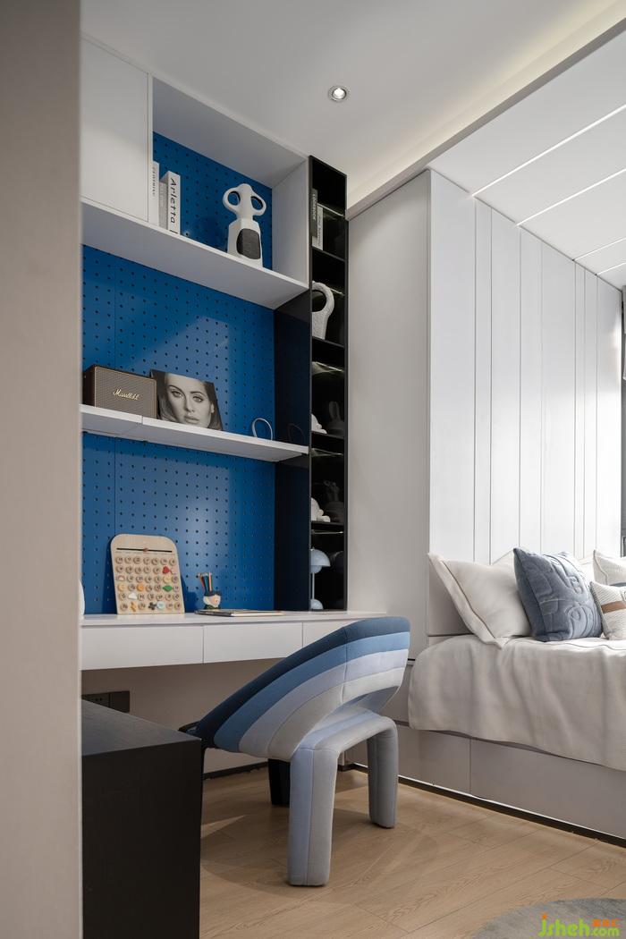藍,是沉靜的,亦是充滿活力的??紤]到次臥的使用者為更年輕的Z世代,因此設(shè)計師并未將中式美學(xué)延續(xù)到次臥之中,藍白色調(diào)搭配時尚家具,賦予空間更強的年輕化與現(xiàn)代感,讓空間與使用者的氣質(zhì)無限契合。