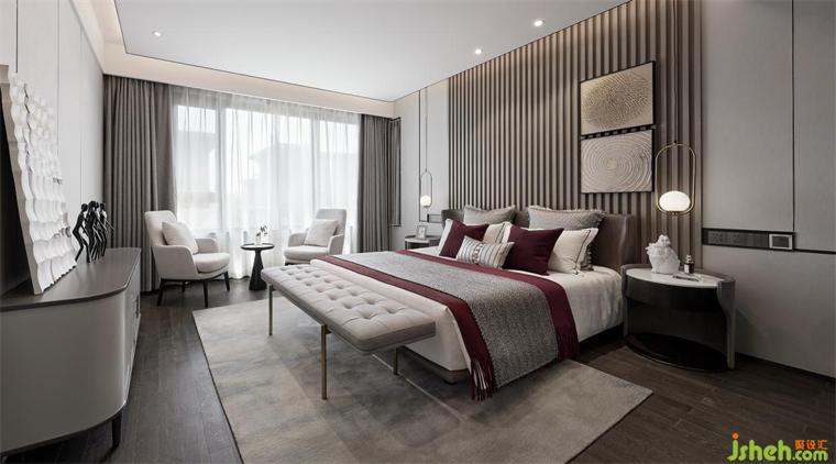 二層主臥克制守序,色調(diào)柔和,氛圍舒心,家具、樣板房設(shè)計(jì)用色和裝飾美學(xué)混用,不管窗外如何喧囂吵鬧、紅塵紛擾,你只想沉浸于此。它不僅是身體的??刻帲蔷竦臈⒌?。