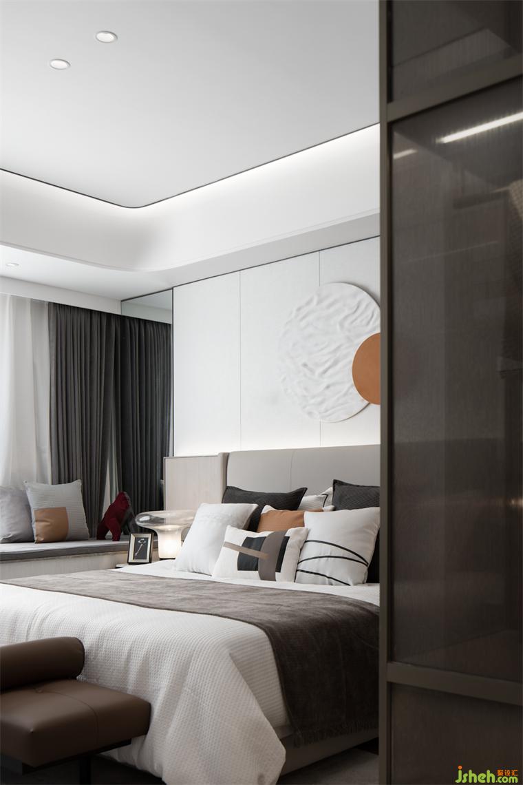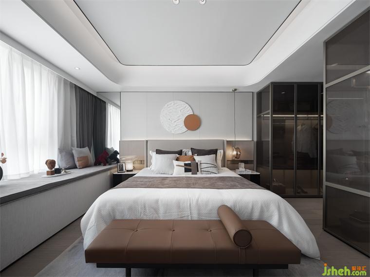 主臥以沉靜溫暖的色調(diào)營造寧靜柔和的空間氣質(zhì),煙波浩渺的海面冉冉升起一輪圓月,樣板間設(shè)計勾勒“月下休憩”的詩意。大面積飄窗延伸空間的更多可能,閱讀、發(fā)呆、靜靜欣賞窗外的風景……多種美好在此發(fā)生。