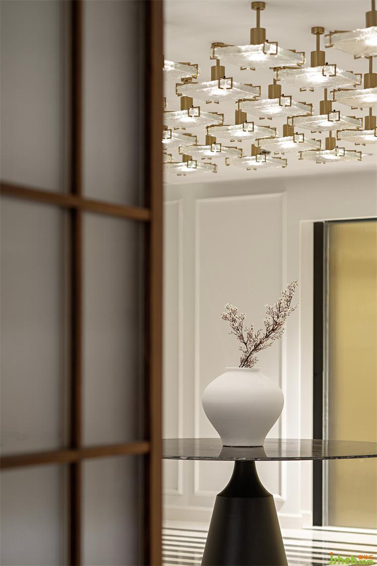 正前方是一面包裹著日月星辰的當(dāng)代藝術(shù)墻,與通往內(nèi)部空間的大門(mén)視覺(jué)歸一。抓人眼球的愛(ài)馬仕橙木飾面和意境畫(huà),與醒目的白色陶罐、黑白回字型地面融為一體,向20世紀(jì)的法國(guó)生活致敬。