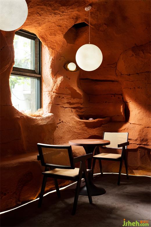 附樓的下沉區(qū),是餐廳意識(shí)的轉(zhuǎn)換指引,圓形吊燈在巖洞一般的餐廳中,廬山民宿設(shè)計(jì)創(chuàng)造著景致的循環(huán)相生。未經(jīng)打磨的粗糲紋理,新舊表達(dá)的碰撞間,石、夯土等天然材料的使用,是為了尊重當(dāng)?shù)靥烊坏纳鷳B(tài)系統(tǒng)和生物多樣性的可持續(xù)性概念。