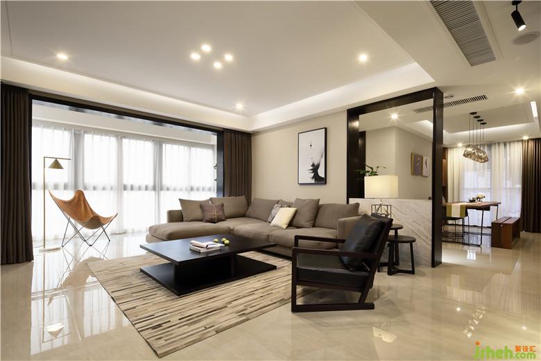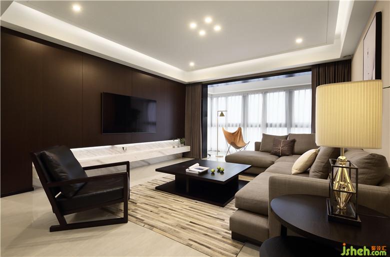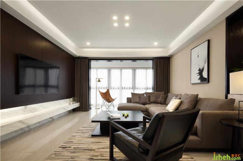 客廳室內(nèi)設(shè)計(jì)師以深胡桃木為主調(diào),輔以爵士白大理石,明暗對(duì)比相得益彰;頂面去繁就簡(jiǎn),既沒有復(fù)雜的造型,也沒有主燈的累贅。設(shè)計(jì)師以極簡(jiǎn)的手法,將點(diǎn)光源與線光源融合一體,構(gòu)成和諧的照明系統(tǒng)。