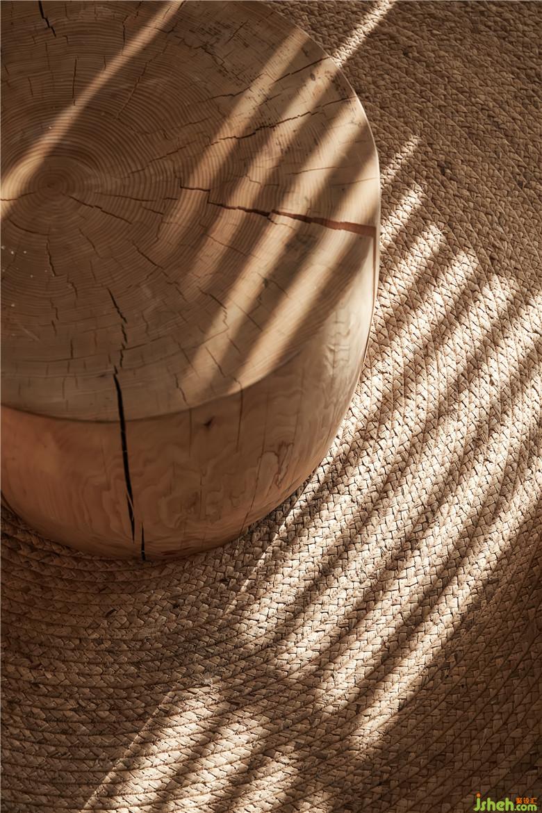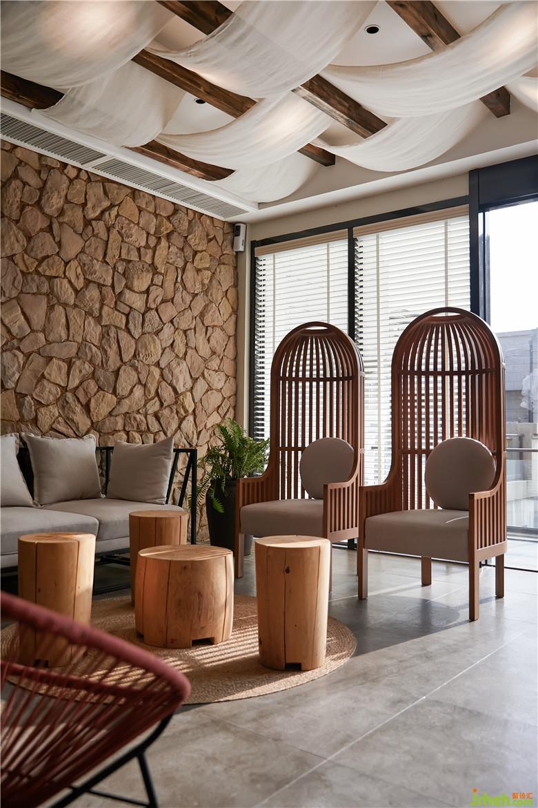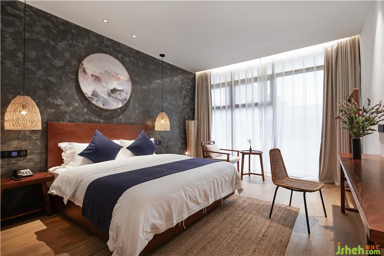 “采樵入深山,山深樹(shù)重疊”。設(shè)計(jì)師對(duì)于室內(nèi)空間整體裝飾上想要營(yíng)造出深山木屋的質(zhì)樸自然、又不失新意的氛圍。房間運(yùn)用了大量的手工藤編藝術(shù)燈具,柔和的光線透出藤編的紋絡(luò),質(zhì)樸溫馨,視感震撼。在質(zhì)樸的基調(diào)上,灰色藝術(shù)涂料與山水藝術(shù)掛畫(huà)給空間增添了濃厚的寫(xiě)意風(fēng)情。輕盈白紗透出的柔和日光映在地板上,靜謐的空間,舒適的座位,靜靜品一盞茶也能悠閑寫(xiě)意,細(xì)數(shù)著輕松假日。老木頭、棉麻、藤編、石材元素搭配適中,冷暖交替,相互映襯,極好得展現(xiàn)了自然質(zhì)樸之視覺(jué)體驗(yàn)。室內(nèi)設(shè)計(jì)師以及酒店創(chuàng)始人都寄望來(lái)客在這里能卸下所有的包袱,把身與心交予自然,讓心靈度個(gè)假。