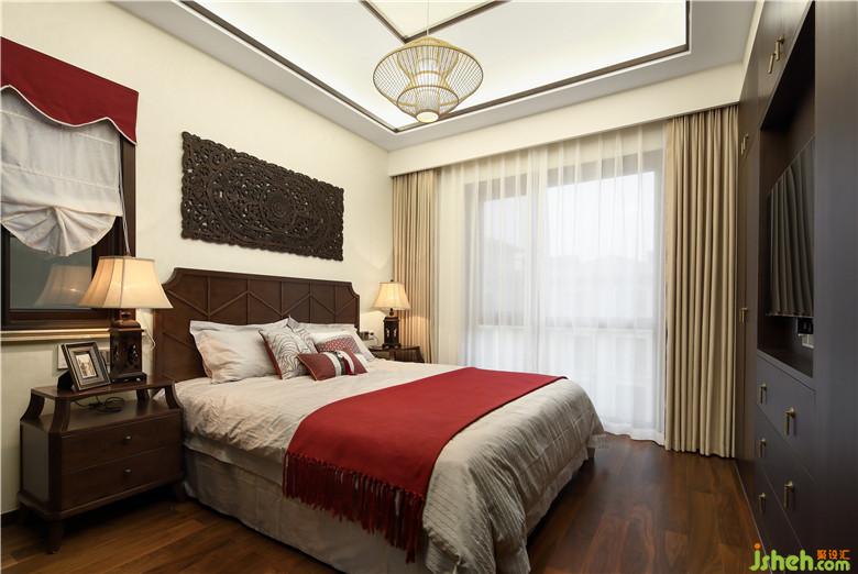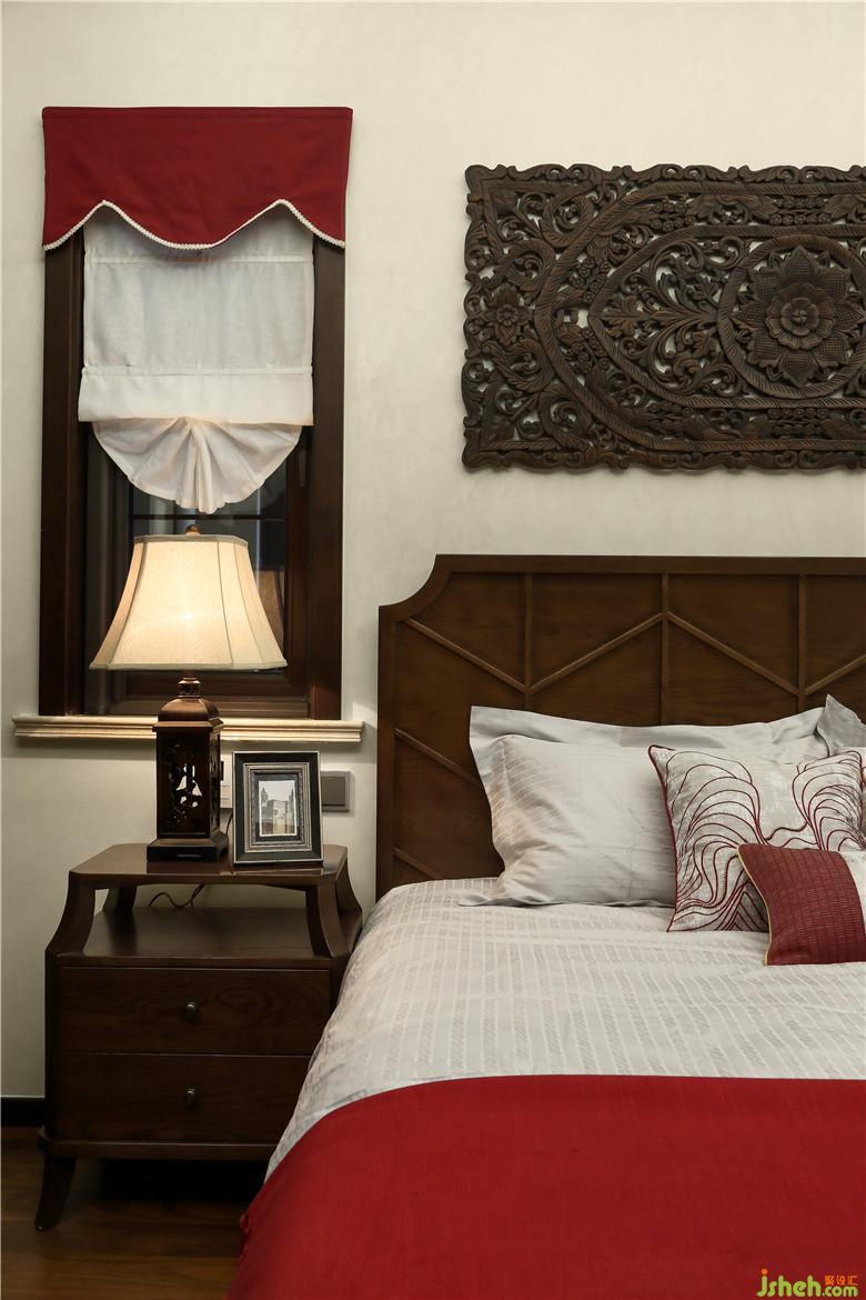 主臥室則體現(xiàn)了主人的品質(zhì)、生活情調(diào)以及生活的私密性。榆木木雕的裝飾畫、床頭柜泰式臺(tái)燈、頂面藤編吊燈,主臥室的原始建筑窗采用東南亞傳統(tǒng)的窗簾樣式進(jìn)行裝飾,彼此相映成輝,古樸的東南亞民族風(fēng)情不彰自顯。