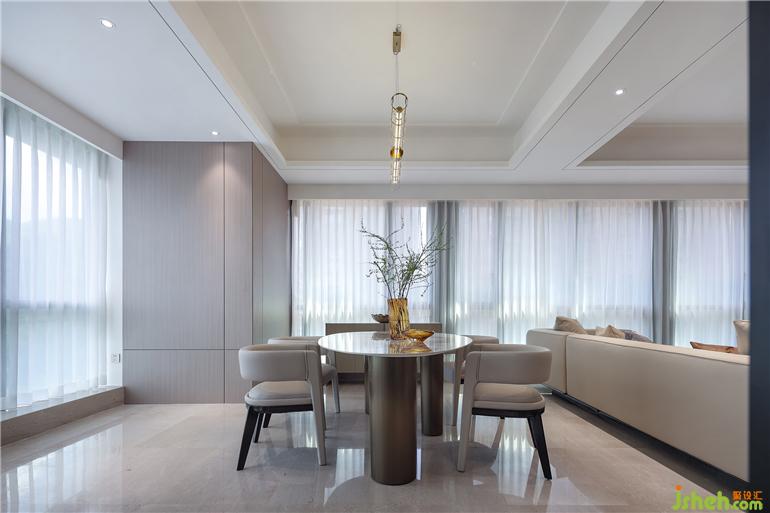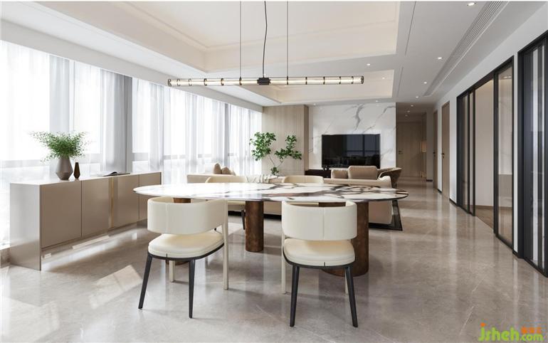 設(shè)計師關(guān)注軟裝細(xì)節(jié)的連續(xù)性,以此凸顯視覺延展的意趣?;⌒螏r板餐桌搭配白色圍合式皮紋餐椅,橘棕色玻璃花器點(diǎn)綴其中,木色餐柜與墻面色彩呼應(yīng)。大平層裝修設(shè)計圓筒狀吊燈灑下柔和的光線,簡潔的色彩,多層次的材質(zhì)串聯(lián)起一日三餐的儀式感。