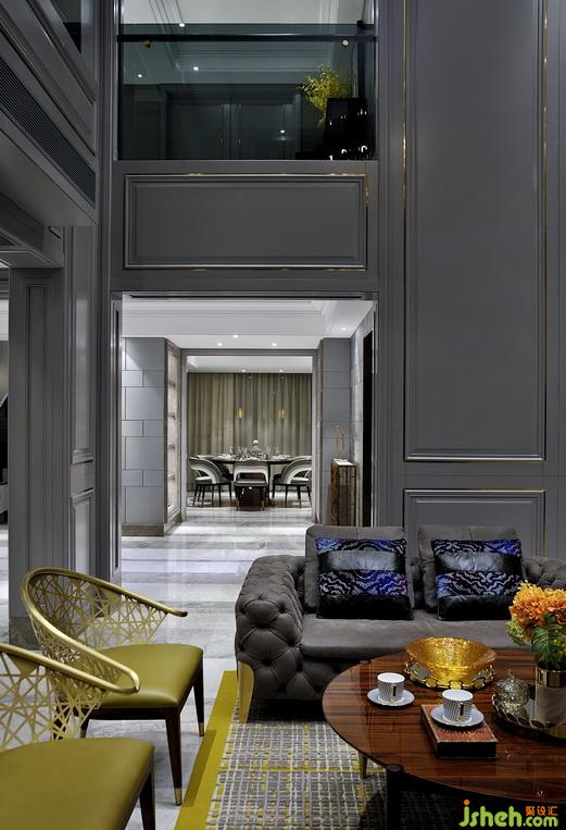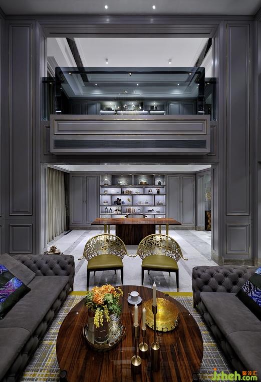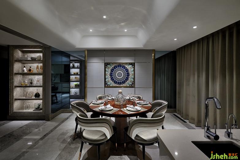 餐廳空間延續(xù)了整體的灰調設計,皮革、金屬、玻璃、大理石、布藝窗簾之間的質感與色彩對比,在高級灰里融合共生,加之極致的細部設計與精湛的工藝,大大增加了空間的可讀性與體驗感。室內設計師