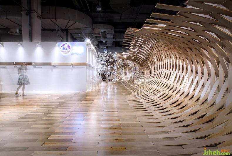 一道起伏奔涌的木色“水浪”橫亙于展館一側(cè),猶如被一股天外旋風撩動般從水平地面上騰空而起鋪卷開來。裝置背部以參數(shù)化設計搭建骨架,不同地板展品依據(jù)顏色深淺拼接交疊,呈現(xiàn)水紋律動一般的空間節(jié)奏和木紋隨年月漸變的視覺色譜。裝置縱向兩端的鏡面借助反射作用構(gòu)成水浪的延伸,將有限的展廳進行了無限的擴展,同時又有一種夢幻迷離之感。