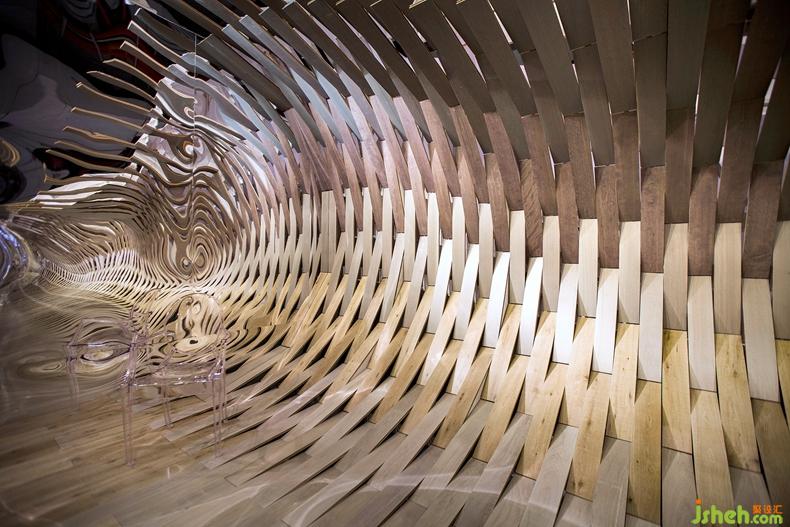 TOWOdesign又將水的美學潛質(zhì)再度延展,以充滿變幻的水流形態(tài)為靈感,打造出一幕極具視覺沖擊的雕塑。每一塊地板部件都被賦予液體形態(tài)的流動旋律,但又包含著木質(zhì)的靜態(tài)紋理。