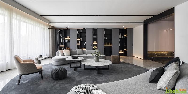 一入玄關(guān)即為一開放空間,客聽、玄關(guān)、走廊、餐廳,用微建筑的概念創(chuàng)造出一條私密的軸線,最適當(dāng)?shù)膶菍釉撚械臋C(jī)能,都縝密的收在這條軸線,合于空間。承襲著樣板間的脈絡(luò),將現(xiàn)代/簡單/純粹/人文/生活等元素用更大的建筑語匯去執(zhí)行整個平層空間,用機(jī)能化的柜體創(chuàng)造室內(nèi)建筑般的量體、軸線等概念??吐牬竺娣e的書墻除了造型層面之外,更加賦予空間產(chǎn)生在人文方面的強(qiáng)烈氣息。