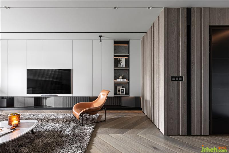 玄關(guān)的木飾面律動(dòng)性的轉(zhuǎn)折延伸至客廳空間,包覆并隱藏了大型收納柜體。