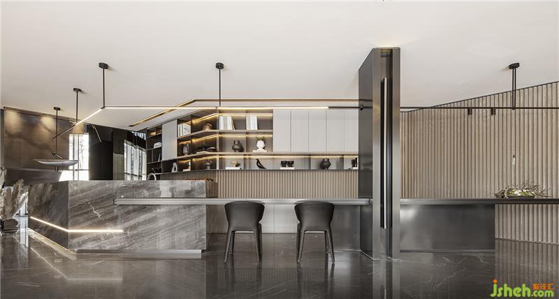 近境制作室內(nèi)設(shè)計貫穿了傾斜與異形的建筑體塊,以棱角分明的現(xiàn)代力量感,有意區(qū)別于生活的自然形態(tài)。深色系的空間基調(diào)之上,漫反射的光照模式和光滑飾面的二次反射相結(jié)合,營造出幽遠(yuǎn)科幻般的視覺廣度。