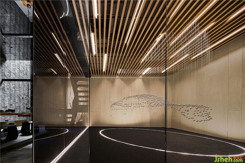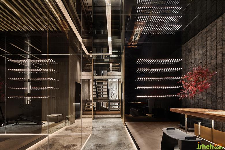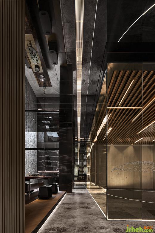 樣板間設(shè)計(jì)連貫的格柵木飾面與石材基調(diào),由玄關(guān)、走廊向著樓梯延伸。