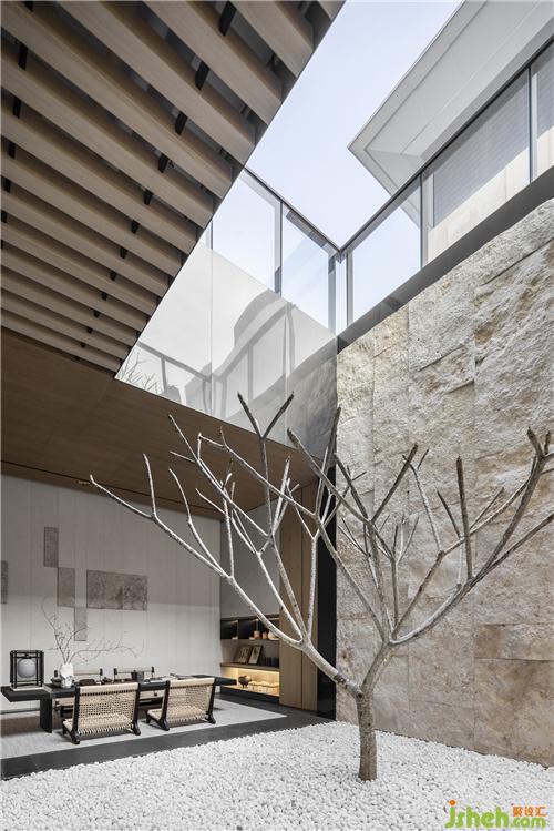 從茶室穿越到戶外泳池,賓客用餐舉辦派對(duì)的同時(shí),可享有前后兩端不同的景觀河水潺潺流動(dòng)的聲音,乘著風(fēng)穿過泳池流進(jìn)耳里,后方茶室靜謐的氛圍,光線被樹葉打散灑落在地面上,映著最深沉的石紋。