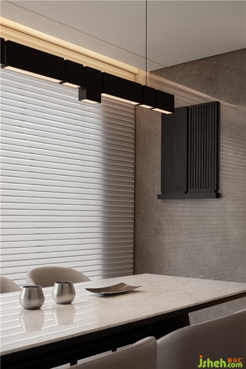 以松柏枝作為暗示、提醒,在入戶玄關(guān)的短暫停留與接收,達(dá)到轉(zhuǎn)換場(chǎng)景的效果,??跇影宸吭O(shè)計(jì)配合墻體分割與延伸,細(xì)節(jié)變化中區(qū)分不同的動(dòng)線,平面配置上以玄關(guān)起始的動(dòng)線左右區(qū)分主客感。