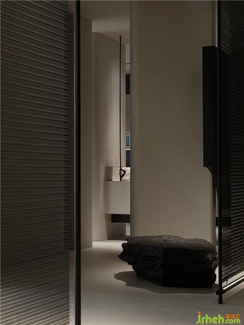 步入展廳,借助材料本身的特質(zhì)傳達(dá)寂靜、溫潤的空間基調(diào),細(xì)節(jié)中墻面穿插不同型態(tài)的藝術(shù)裝置,與微水泥的特性產(chǎn)生強烈的對比,堅硬與柔軟、力量與溫柔豐富空間語言,同時在視覺上藝術(shù)品的懸浮感,增加空間靈動。