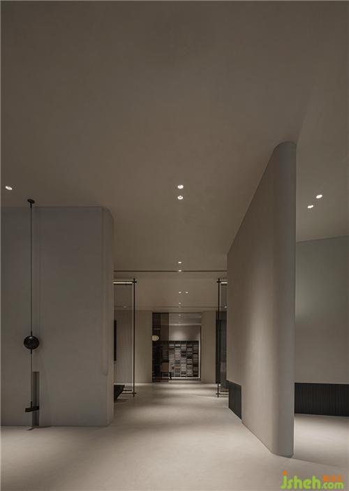 作為整個(gè)空間視覺的焦點(diǎn),利用弧形的墻體與特定形態(tài)的幾何懸浮裝置,引入自然“山與石”的概念,讓人與自然、建筑的關(guān)系更親密和諧,以此達(dá)到“物境—意境—心境”三層的遞進(jìn)關(guān)系。