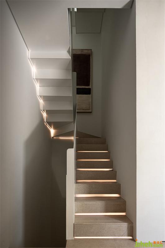 踏階以簍空的形式,利用金屬隔屏使空間簡約明快,線性光源詮釋了空間層次感。