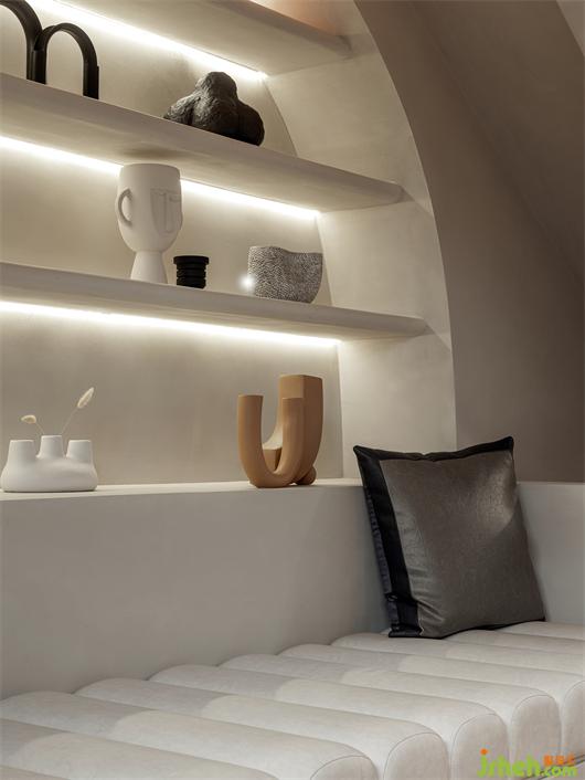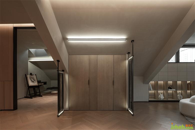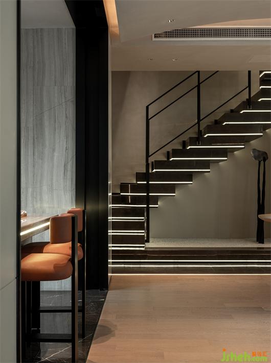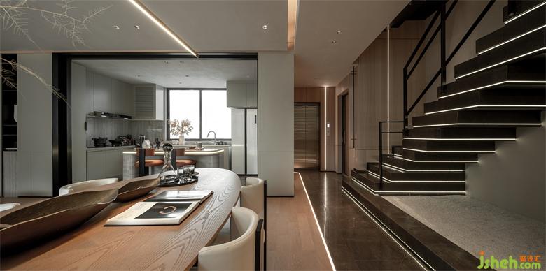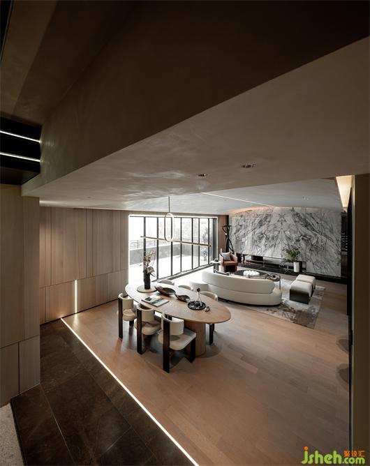 本案以溫潤的木皮紋理與柔軟的墻布做為基底,奢石與不銹鋼的結(jié)構(gòu)作為空間的互動對比關(guān)系。樣板間設計將空間做中垂直水平的分割,使其量體彰顯輕奢感,延續(xù)其型態(tài)轉(zhuǎn)折至不同空間。