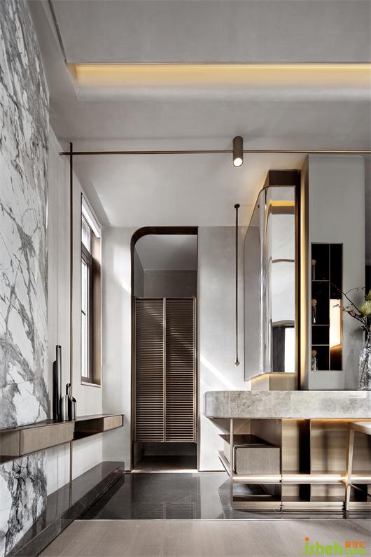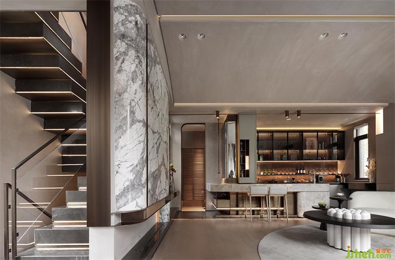 客廳設(shè)計(jì)延伸了客廳的多維想象及藝術(shù)審美的無限可能,黑白水墨紋的大理石,配合金屬的吧臺(tái),搭配精致的器皿,一幅城市墨畫定格時(shí)間的會(huì)客空間。