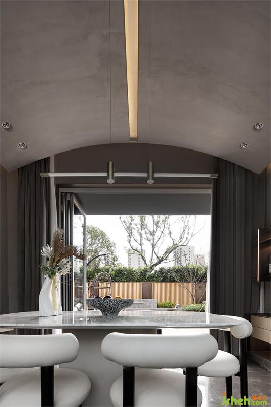 餐廳與前后庭院連成一體的“社交模式”,樣板間設(shè)計(jì)也可以成為各自獨(dú)立的“陪伴模式”。多變的空間展現(xiàn)了業(yè)主夫妻崇尚自由、鐘愛品質(zhì)生活的態(tài)度,讓人從多維的生活場景中感知自然氣息與藝術(shù)風(fēng)尚,伴隨著富有格調(diào)的三餐四季。