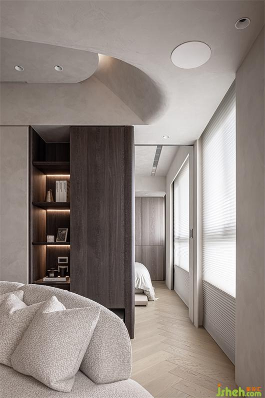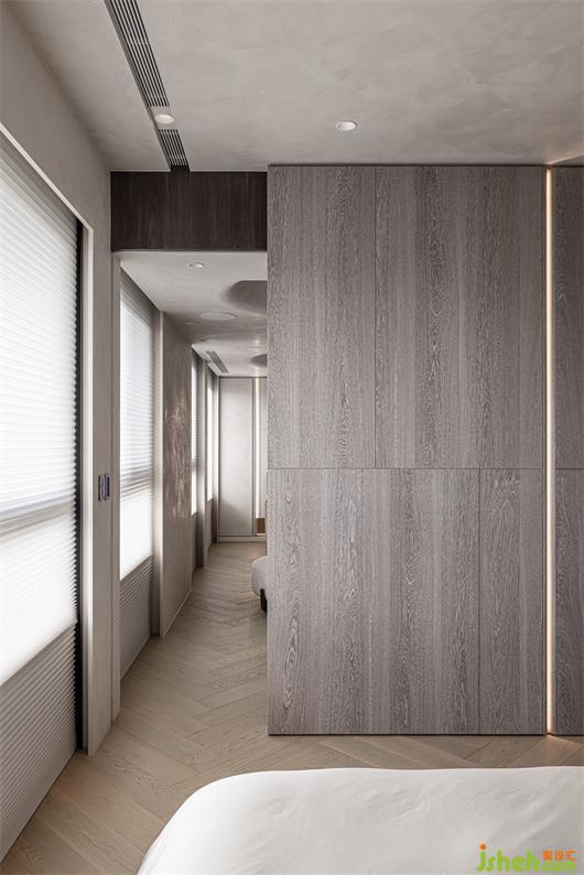 豪宅設計房間沿用微水泥與木地板的搭配,整體樸實的色調(diào),加入柜體崁燈和弧線的平衡,床頭以皮革與壁布搭配,將空間的尺度最大的保留給生活空間,床頭內(nèi)崁燈將空間氛圍呈現(xiàn)更為溫柔的氣息。