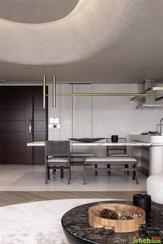 中性的空間背景,自然質(zhì)感的木質(zhì)元素,結(jié)合空間中柔軟的織物與局部石材、金屬的點綴,讓空間呈現(xiàn)更干凈時尚且?guī)в袦剀盎{(diào)