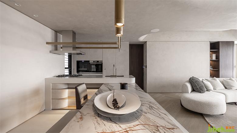 有如空中洞穴般,讓屋主兩夫妻可以在高樓層享受自然的樸實(shí)生活,環(huán)形的動(dòng)線,豪宅設(shè)計(jì)讓每個(gè)空間都能相互連結(jié),開(kāi)闊的客餐廳,能讓陽(yáng)光灑落在每個(gè)角落,利用兩個(gè)大弧形造型天花板,營(yíng)造出洞穴的有機(jī)感,減少空間銳利的線條及弱化建筑的結(jié)構(gòu)大梁,香繽色的鐵件就有如洞穴里的結(jié)晶,閃閃發(fā)光。