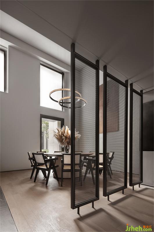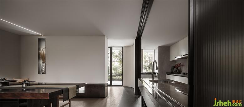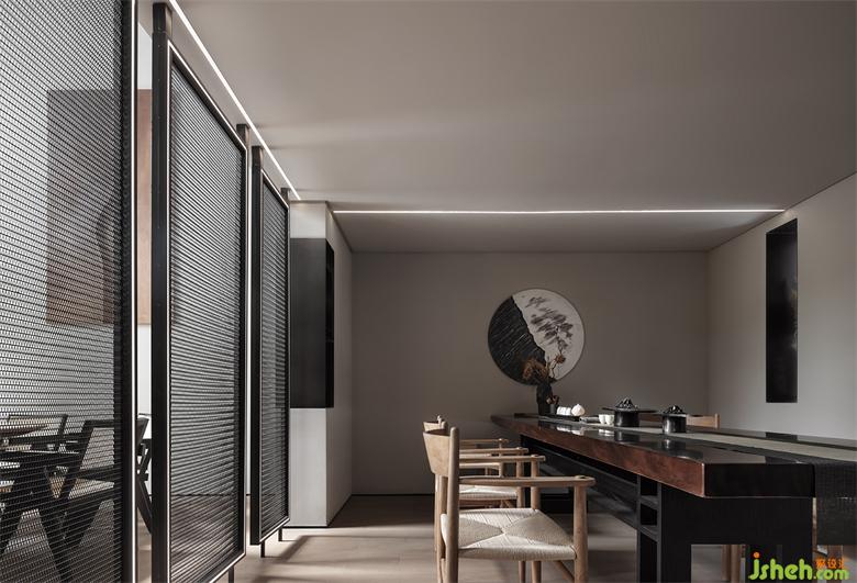 前廳的島臺(tái)與水吧臺(tái)透過墻體穿插連續(xù)在一起,“天際線”的光線延續(xù)了空間,將彼此牽引在一起。武漢會(huì)所設(shè)計(jì)平滑細(xì)膩黑鈦不銹鋼與富有肌理感的微水泥塑造沉靜感的異形空間,溫潤(rùn)的木皮與冰冷的石材裝裱空間的張馳華麗。