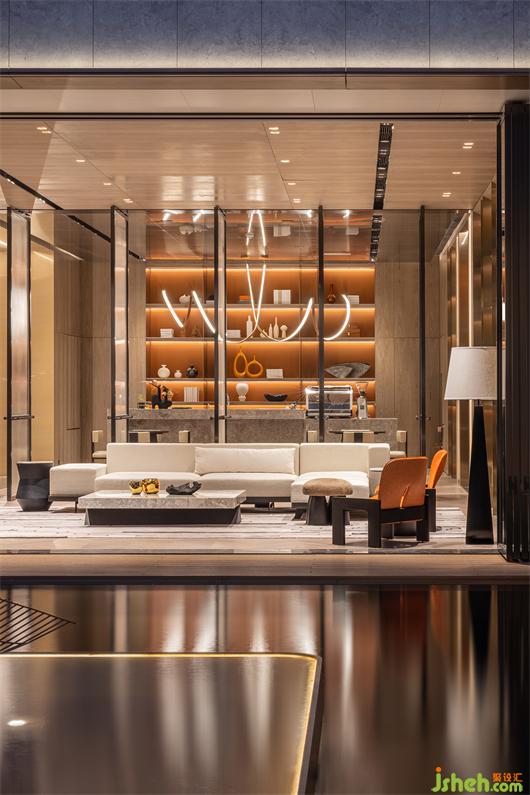 售樓處操作方式有別于以往的臨時性建筑,利用天然的地勢高差將主建筑的負一層打造為售樓處,采用私人社交俱樂部的營運設定結合高定化會所機能,未來售樓階段結束后直接轉化為會所,交由專業(yè)營運機構采用會員制運營,為小區(qū)提供社交空間。