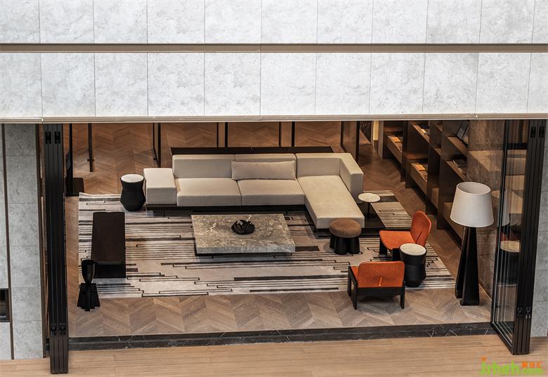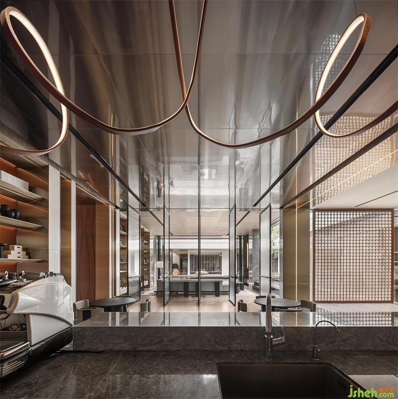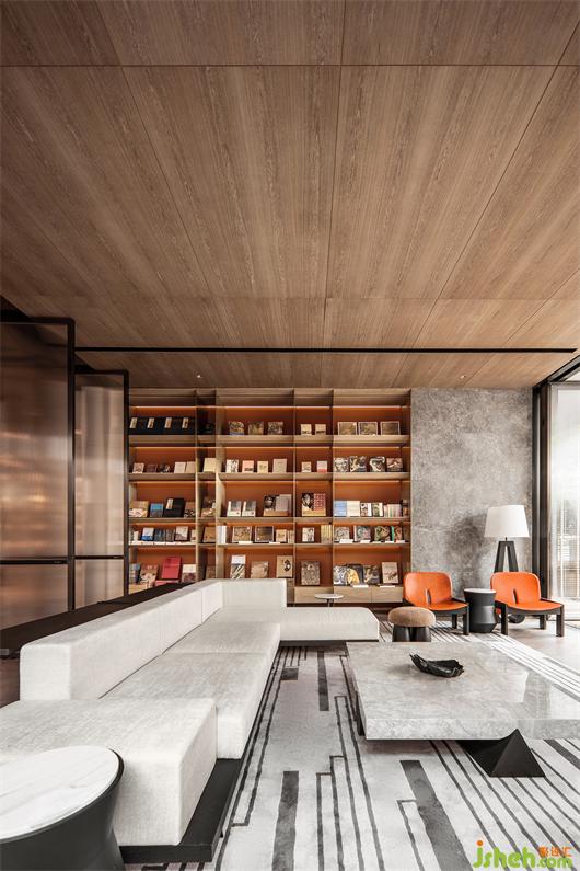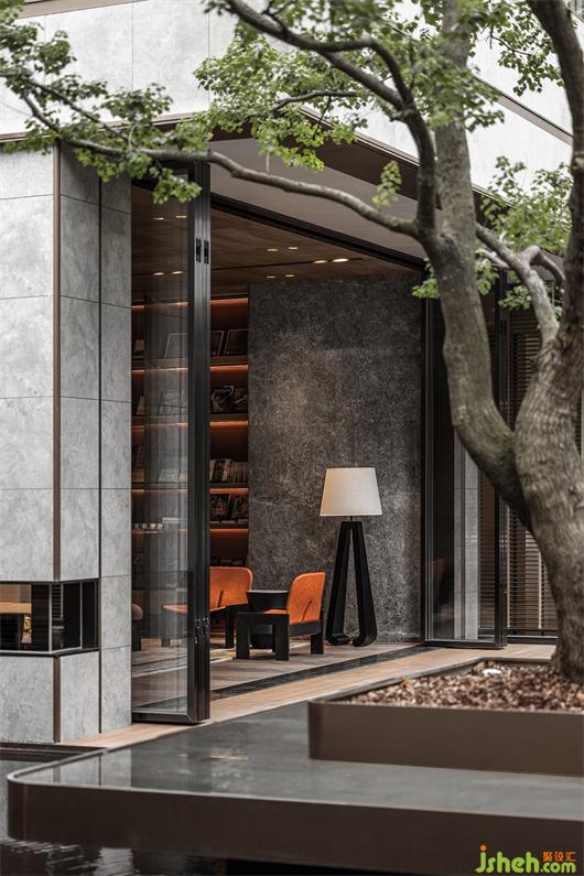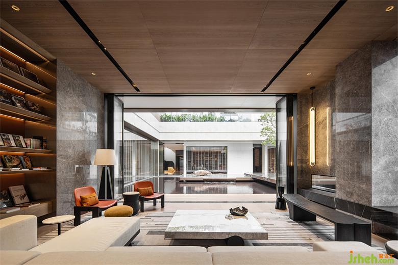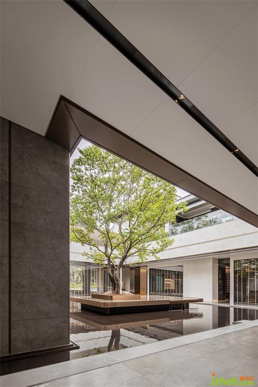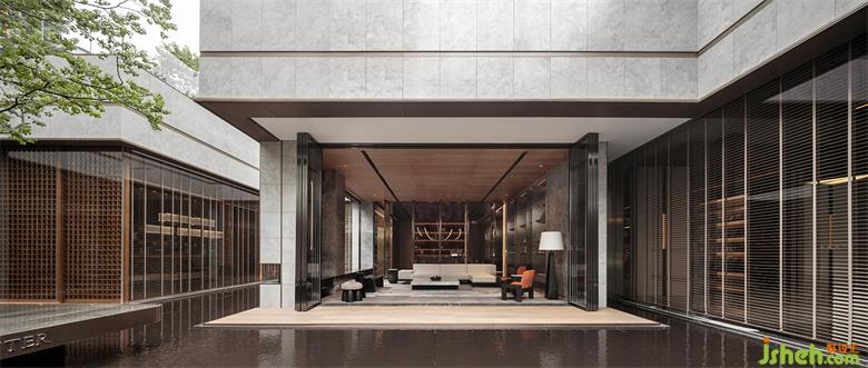 本案建筑量體為五棟塔樓,一層為庭園景觀連接戶外露天泳池及吧臺區(qū),中間開有口字型大型采光天井,會所設(shè)計將光線及自然景觀引入負(fù)一層的會所空間,透過中庭水面的波光反射創(chuàng)造空間中的戲劇性。