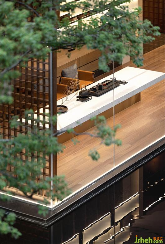 在漂浮的兩個盒子中,洽談區(qū)透過折門的運用,將沙發(fā)區(qū)整體空間打開與中庭水面連結,將內外空間連成一體,雨天時可以在沙發(fā)上細聽雨聲。茶室則是以較低臺度的家具設定,接近席地而坐的高度讓使用者與水面的尺度感更親近一些,并透過格子窗扇,在黃昏時讓交錯的光影灑落在茶室的空間之中。