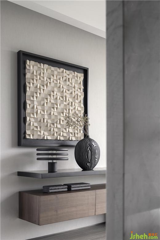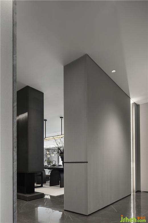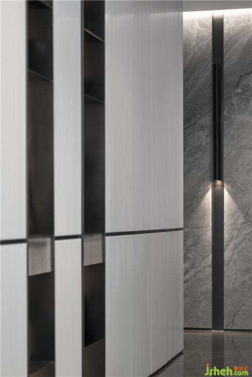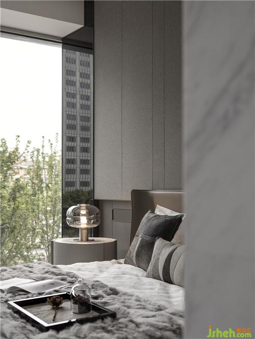 在主臥與私領域的廊道細節(jié)裝點的設定,過道的氣氛即產(chǎn)生變化,豪宅裝修設計增進日常生活的儀式感,物境–意境–心境的轉(zhuǎn)變。主臥房為套房設計,以溫潤的皮革、柔軟的墻布,展現(xiàn)氣質(zhì)與溫度營造沉穩(wěn)克制的氛圍,木地板與石材的地面鋪設方式釋放了空間的視覺感,尺度舒適,對材料進行重新分割組合,強化空間品質(zhì)。