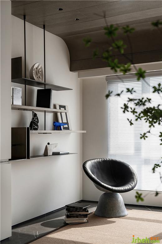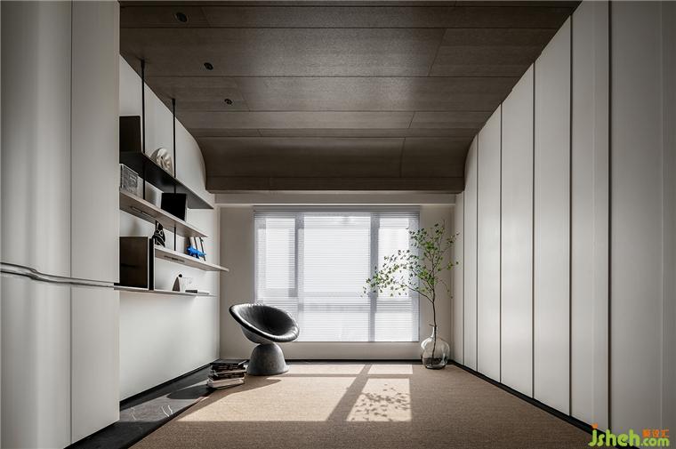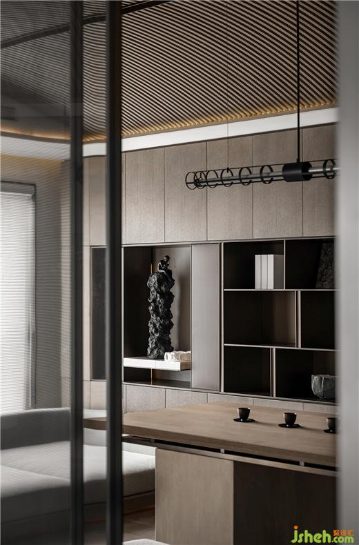茶室.會客區(qū)整體抬高處理,天地軸玻璃門分空間區(qū)域,形成主人靜謐獨立的空間。